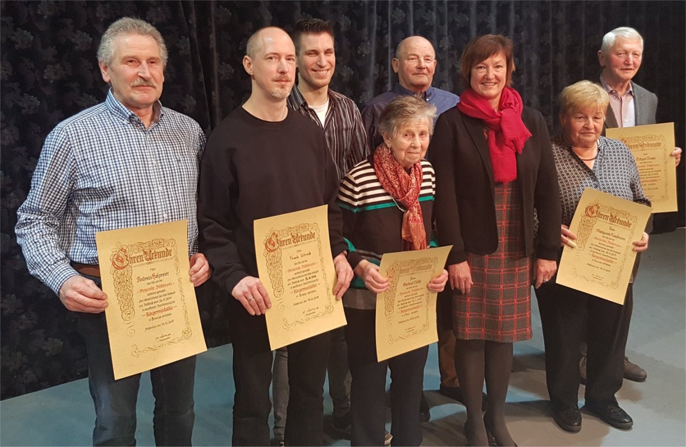 Am Donnerstag, dem 19.12.2019, fand dieses Jahr erstmalig die Jahresabschlusssitzung des Gemeinderates in der Aula der Grundschule statt. Bürgermeisterin Agnes Engelhardt begrüßte zu Beginn die anwesenden Gemeindräte mit Partner, Altbürgermeister Richard Krebs mit Ehefrau Anna, die Mitarbeiter der Gemeinde sowie die Ehrengäster dieses Abends, die Empfänger der Bürgermedaillen mit Partner. Nach einem Rückblick in Form einer PowerPoint- Präsentation auf das Jahr 2019 durch unsere 1. Bürgermeisterin ergriff im Anschluß 2. Bürgermeister Horst Wiesmann das Wort und dankte Agnes, stellvertretend für die Gemeinderäte, für die gute und konstruktive Zusammenarbeit in diesem Jahr. Nach dem gemeinsamen Abendessen erhielt Andreas Väth für besondere sportliche Leistungen ein Präsent und die Ehrengäste wurden mit den Bürgermedaillen in verschiedenen Stufen ausgezeichnet.