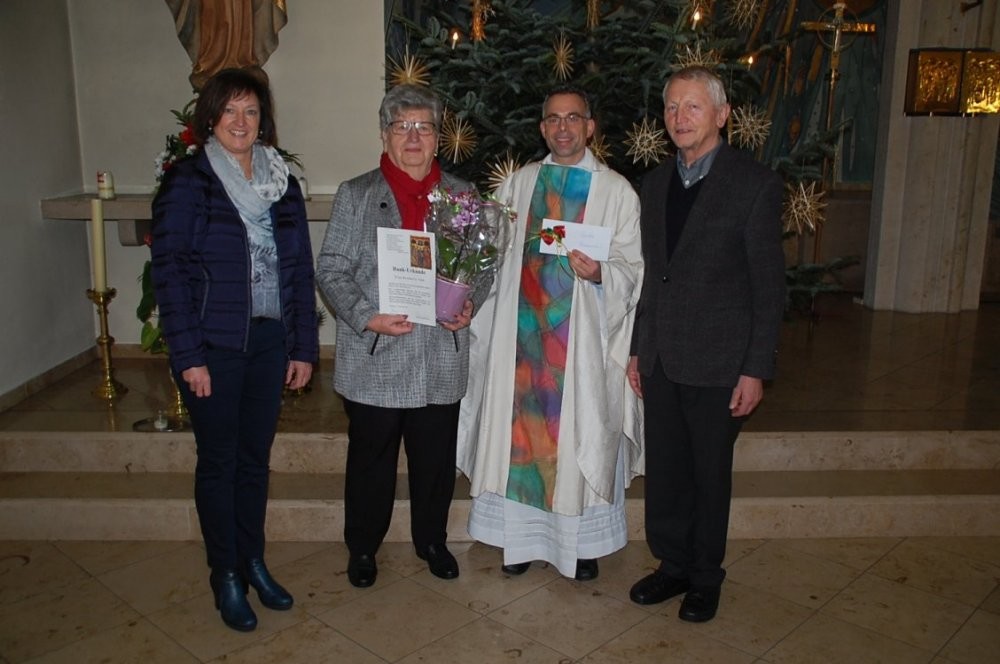 Zum Ende des Jahresschlussgottesdienstes an Sylvester dankten und verabschiedeten Pfarrer Alexander Eckert mit einer bischöflichen Dankurkunde, Kirchenpfleger Erhard Krebs für die Kirchengemeinde mit einem Gutschein und Bürgermeisterin Agnes Engelhardt für die politische Gemeinde Rosemarie Väth als langjährige Leiterin